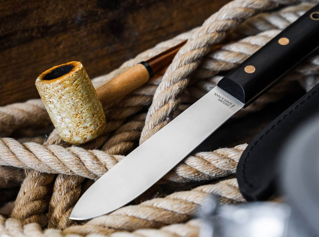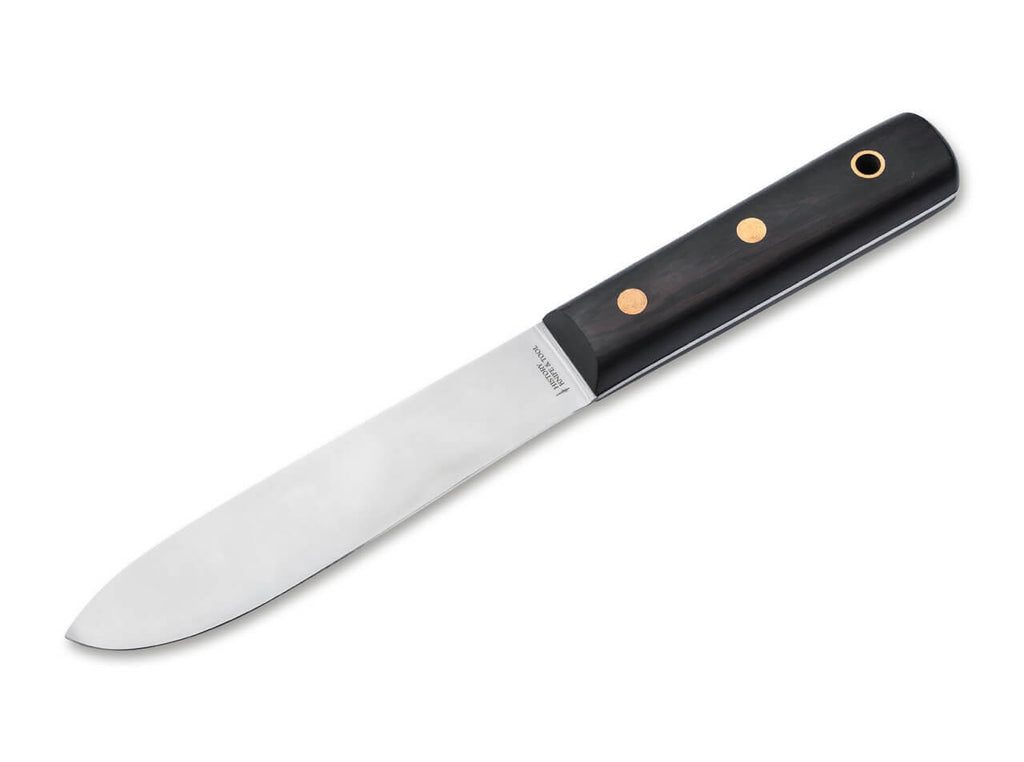 Das History Knife & Tool Sailor’s Knife ist das zentrale und ursprünglichste Messer der internationalen Handelsschifffahrt und der Marine. Die Bundesmarine führt noch heute diese Messer mit minimalen Abweichungen; die Spezifikationen sind in der technischen Lieferbedingung TL 5110-0026 festgehalten. Das Messer erscheint auf den ersten Blick unscheinbar, aber gerade die urtypische schlichte Form garantiert seine hohe Funktionalität und universelle Einsetzbarkeit. Allen Matrosenmessern, egal von welchem Hersteller, sind traditionell salzwasserbeständige Ebenholz-Griffschalen mit zwei Messingnieten und einem messinggefassten Fangriemenloch sowie eine robuste schwarze Lederscheide mit Gürtelschlaufe gemeinsam. Das Herzstück bildet die dünne, flachgeschliffene, hauptsächlich gerade und leicht bauchige Droppoint-Klinge. Ein Name sollte im Zusammenhang mit dem „Sailor’s Knife“ aufgrund der auffälligen Ähnlichkeit genannt werden: Horace Sowers Kephart (1862 – 1931) war Reise- und Outdoor-Schriftsteller und gilt – zusammen mit George Washington Sears und Henry David Thoreau – als einer der Pioniere und Urväter der modernen Bushcraft-Szene. Das von ihm entwickelte und heute von Fachleuten gefeierte Kephart Knife weist eine starke Übereinstimmung der Außenkontur mit dem „Sailor’s Knife“ auf. Ob und in welche Richtung eine Inspiration zwischen den beiden Messern geflossen ist, lässt sich heute nicht mehr sagen. Vielleicht liegt die Ähnlichkeit auch nur an der archetypischen Schlichtheit und kompromisslosen Funktionalität des Designs. Warnhinweise und Sicherheitsinformationen:Schnittverletzungen: Die häufigste Gefahr bei der Verwendung von Messern ist das Risiko von Schnittverletzungen. Scharfe Klingen können schnell durch Haut und Gewebe dringen.Abrutschen des Messers: Ein unsachgemäßes oder zu starkes Drücken kann dazu führen, dass das Messer abrutscht und unkontrollierte Bewegungen entstehen, die Verletzungen verursachen können.Verletzungen durch Stürze: Messer sollten niemals ungesichert oder in der Nähe von Tischkanten abgelegt werden, um zu verhindern, dass sie herunterfallen und jemanden verletzen.Stumpfe Messer: Stumpfe Messer stellen ein größeres Verletzungsrisiko dar, da sie mehr Kraft erfordern und leichter abrutschen können. Messer sollten daher regelmäßig sachgemäß nachgeschärft werden.Nicht bestimmungsgemäße Nutzung: Das Verwenden eines Messers für Aufgaben, für die es nicht vorgesehen ist (z.B. als Hebelwerkzeug), kann nicht nur die Klinge beschädigen, sondern auch zu Unfällen führen.