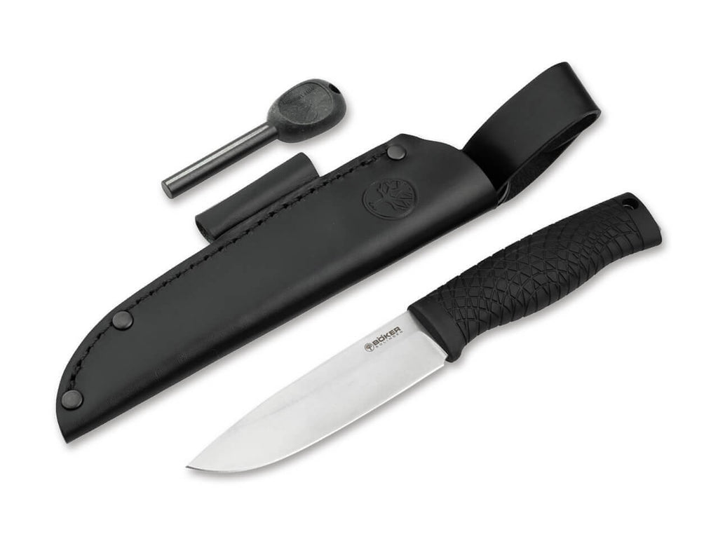Bei der Konzeption unseres neuen feststehenden Outdoor-Messers Böker Bronco haben wir uns ehrgeizige Ziele gesetzt. Es sollte auf dem neuesten Stand der technischen Möglichkeiten sein und optimale Funktionalität im Hinblick auf moderne Bedürfnisse bieten. Zu diesem Zweck sollte es folgende Eigenschaften aufweisen:-Universelle und optimale Einsatzfähigkeit für sämtliche professionellen Outdoor-Anwender wie: Bushcrafter, Campcrafter, Survivalisten, Streckenwanderer, Jäger, SAR-Teams und andere- Eine Klinge aus CPM-Stahl auf dem höchsten Stand der metallurgischen Möglichkeiten- Ein Griff, der auch bei langem Arbeiten angenehm in der Hand liegt, die durchgängige Angel vollständig umschließt und bei Kälte keine Wärme aus der Hand ableitet - Ein hochwertige Lederscheide, die mit und ohne Dangler getragen werden kann, das Messer vor Verlust und Beschädigung schützt, über eine Aufnahme für einen Feuerstahl verfügt und mit einem solchen ausgestattet ist- 100% Fertigung am Standort Solingen/Germany- Ein moderater Preis im Hinblick auf die AusstattungDiese ambitionierten Anforderungen konnten wir in der folgenden Weise umsetzen: Der CPM-3V wurde von Crucible Industries LLC – dem Spezialisten und weltweiten Marktführer für pulvermetallurgische Stähle – entwickelt, um bei einer sagenhaften Schnitthaltigkeit und Härte von 61±1 HRC eine bisher ungekannte Schocklastverträglichkeit, Bruchelastizität und Splittersicherheit zu gewährleisten. Diese Eigenschaften des pulvermetallurgischen Kohlenstoffstahles wurden unter anderem durch einen genau abgestimmten Chromgehalt von 7,5% erreicht. Auf diese Weise konnten die positiven Eigenschaften des Legierungselementes Cr wie die Steigerung der Verschleißfestigkeit und Härtbarkeit genutzt und gleichzeitig ein feines Gefüge erhalten werden.Die universale breite Droppoint-Klinge mit hoch angesetztem Saber-Grind ist seit jeher die bevorzugte Form des Jägers für Hoch- und Niederwild und eignet sich außerdem sowohl für feine Aufgaben wie das Stöckefedern als auch fürs Grobe wie das obligatorische Batoning. Der Erl ist durchgängig und ragt einige Millimeter aus dem Griffende. Das sorgt für das Maximum an Stabilität und die Angel verträgt auch kräftige Schläge mit einem Rundholz oder anderem Gegenstand. Ein kurzer Teil des Klingenrückens bildet beidseitig scharfe 90°-Kanten zum Funken schlagen aus dem mitgelieferten Feuerstarter. Als Griffmaterial wurde TPE – thermoplastisches Elastomer – gewählt, das den Erl vollständig umschließt und mit einer in jede Belastungsrichtung griffigen Struktur versehen ist. TPE ist widerstandsfähig, elastisch, rutschfest und hat eine geringe Wärmeleitfähigkeit. Das Messer liegt also bei allen Witterungs- und Arbeitsbedingungen sicher in der Hand und zieht bei Nässe und Kälte die Kraft nicht aus den Fingern. Gegenüber gewöhnlichen Elastomeren hat TPE zudem den Vorzug die Umwelt in der Fertigung zu entlasten, da diese rein physikalisch erfolgt und die langwierige und energieaufwändige Vulkanisierung chemisch vernetzter Elastomere entfällt.Zur Ausstattung gehört eine Köcherlederscheide – die Königsdisziplin im Scheidenbau - mit tiefem und festem Sitz des Messers. Das Messer ist beim Führen somit sowohl vor Verlust als auch vor Beschädigung bestmöglich geschützt, ohne eine beschädigungsanfällige Sicherung zu erfordern, die den schnellen Zugriff erschwert. Ein abnehmbarer Dangler ermöglicht wahlweise entweder eine hohe Trageposition am Gürtel oder eine Tiefe unter dem Hüftgurt des Tourenrucksacks. Zusätzlich ist das Messer mit einem 9,3 cm Feuerstarter / Metalmatch des Marktführers Light My Fire (Swedish FireSteel Bio Army Slatyblack) ausgestattet, der in einer breiten, fest in die Keder integrierten, eng sitzenden Lederschlaufe Platz findet. Somit wird das Böker BRONCO zum kompakten, vielseitigen und vollständigen Wildnis- und Überlebenswerkzeug, das jeder Situation gewachsen ist. Warnhinweise und Sicherheitsinformationen:Schnittverletzungen: Die häufigste Gefahr bei der Verwendung von Messern ist das Risiko von Schnittverletzungen. Scharfe Klingen können schnell durch Haut und Gewebe dringen.Abrutschen des Messers: Ein unsachgemäßes oder zu starkes Drücken kann dazu führen, dass das Messer abrutscht und unkontrollierte Bewegungen entstehen, die Verletzungen verursachen können.Verletzungen durch Stürze: Messer sollten niemals ungesichert oder in der Nähe von Tischkanten abgelegt werden, um zu verhindern, dass sie herunterfallen und jemanden verletzen.Stumpfe Messer: Stumpfe Messer stellen ein größeres Verletzungsrisiko dar, da sie mehr Kraft erfordern und leichter abrutschen können. Messer sollten daher regelmäßig sachgemäß nachgeschärft werden.Nicht bestimmungsgemäße Nutzung: Das Verwenden eines Messers für Aufgaben, für die es nicht vorgesehen ist (z.B. als Hebelwerkzeug), kann nicht nur die Klinge beschädigen, sondern auch zu Unfällen führen.