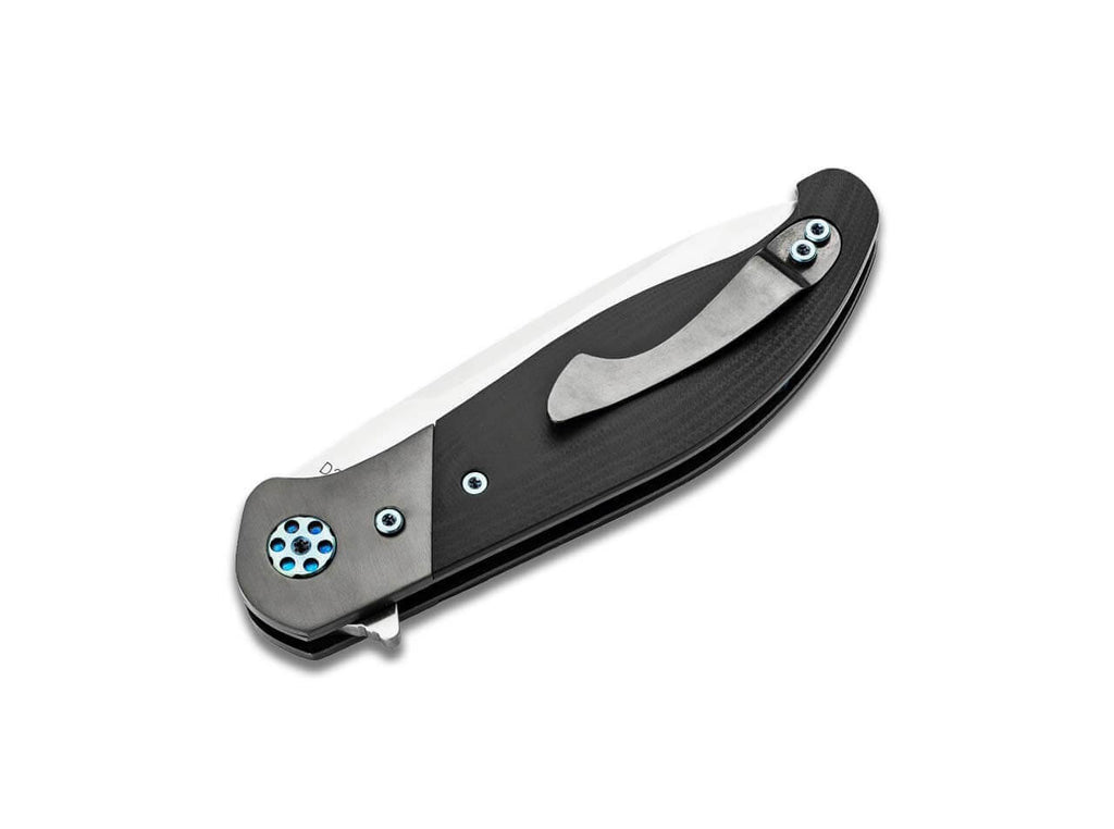 Ruhe und Kraft als stetiges Spannungsfeld zwischen den Elementen; die Willkür der Launen geprägt von Unausweichlichkeit, Demut und Bewunderung. Ein Gegeneinander für das Miteinander. Lorien Arnold nutzt die Kräfte der Natur als Inspiration für seine eindrucksvollen Designs. Mit dem Böker Plus Undertow präsentiert der kanadische Custom-Messermacher ein EDC-Messer mit besonderer Sogwirkung. Die kugelgelagerte Droppoint-Klinge mit Satin-Finish und Fehlschärfe fängt dort an, wo scharf aufhört. Vom Zerschneiden von Pappe bis hin zu kleinen Einsätzen beim Camping ist das Taschenmesser über jeden Zweifel erhaben. Jimpings am Klingenrücken, der ausgeprägte Flipper zur Öffnung des Folders sowie der stabile Liner Lock erhöhen die Arbeitssicherheit, während der zweigeteilte Griff mit Edelstahlbacken im Titan-Finish und schwarzen G10 Griffschalen energiegeladene Gewitterwolken interpretieren. Das Thema Wasser wird in vielfältiger Weise durch die revolverartige Klingenachsschraube sowie die Griffschrauben aufgegriffen, die jeweils in einem tiefen Blau eloxiert sind. Naturgewalt im Taschenformat oder anders ausgedrückt: The Undertow is in the flow. Nur zu bändigen durch den Tip-Up Clip (r) und dem hochwertigem Nylon-Etui zur Aufbewahrung. Warnhinweise und Sicherheitsinformationen:Schnittverletzungen: Die häufigste Gefahr bei der Verwendung von Messern ist das Risiko von Schnittverletzungen. Scharfe Klingen können schnell durch Haut und Gewebe dringen.Abrutschen des Messers: Ein unsachgemäßes oder zu starkes Drücken kann dazu führen, dass das Messer abrutscht und unkontrollierte Bewegungen entstehen, die Verletzungen verursachen können.Verletzungen durch Stürze: Messer sollten niemals ungesichert oder in der Nähe von Tischkanten abgelegt werden, um zu verhindern, dass sie herunterfallen und jemanden verletzen.Stumpfe Messer: Stumpfe Messer stellen ein größeres Verletzungsrisiko dar, da sie mehr Kraft erfordern und leichter abrutschen können. Messer sollten daher regelmäßig sachgemäß nachgeschärft werden.Nicht bestimmungsgemäße Nutzung: Das Verwenden eines Messers für Aufgaben, für die es nicht vorgesehen ist (z.B. als Hebelwerkzeug), kann nicht nur die Klinge beschädigen, sondern auch zu Unfällen führen.