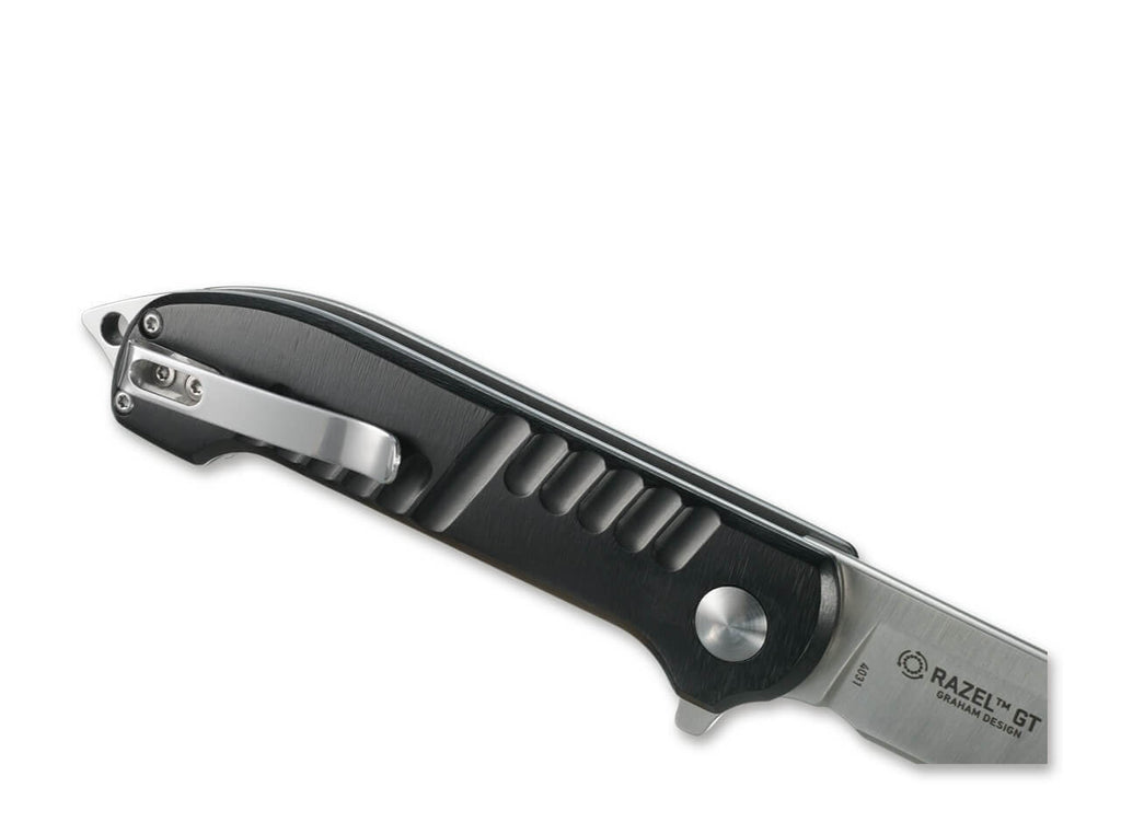 Hinweis: Seit dem 31.10.2024 gilt in Deutschland ein generelles Umgangs- und Besitzverbot von Springmessern aller Art. Es handelt sich ab sofort um verbotene Gegenstände, deren Besitz strafbar ist. Der Besitz von bestimmten Springmessern ist gem. Anlage 2 zum Waffengesetz Abschnitt 1 Nummer 1.4.1 nur noch Personen erlaubt, bei denen ein berechtigtes Interesse besteht, das eine einhändige Nutzung erforderlich macht (etwa aufgrund eines fehlenden Arms oder einer fehlenden bzw. dysfunktionalen Hand), oder der Umgang im Zusammenhang mit der Berufsausübung (z.B. Jagd, Handwerk) oder dem Sport (z.B. Segeln oder Bergsteigen) erfolgt. Gleiches gilt für gewerbliche Händler oder Hersteller solcher Messer. Die Abgabe erfolgt daher nur noch an berechtigte Personen. Bitte prüfen Sie vor der Bestellung, ob ein solches berechtigtes Interesse bei Ihnen vorliegt.Jon Graham zündet mit dem CRKT Razel GT den Turbo und stattet das Messer mit einer umfangreichen Ausstattung aus. Die Meißel artige Klinge aus 8Cr13MoV eignet sich für vielseitige Aufgaben und ist mit einem Satin-Finish versehen. Der Griff aus Aluminium ist äußerst robust und liegt sicher in der Hand. Der federunterstützte Flipper öffnet das Messer und verriegelt die Klinge mit dem sicheren Linerlock. Die Fangriemenöse kann bei Bedarf als Glasbrecher verwendet werden. Warnhinweise und Sicherheitsinformationen:Schnittverletzungen: Die häufigste Gefahr bei der Verwendung von Messern ist das Risiko von Schnittverletzungen. Scharfe Klingen können schnell durch Haut und Gewebe dringen.Abrutschen des Messers: Ein unsachgemäßes oder zu starkes Drücken kann dazu führen, dass das Messer abrutscht und unkontrollierte Bewegungen entstehen, die Verletzungen verursachen können.Verletzungen durch Stürze: Messer sollten niemals ungesichert oder in der Nähe von Tischkanten abgelegt werden, um zu verhindern, dass sie herunterfallen und jemanden verletzen.Stumpfe Messer: Stumpfe Messer stellen ein größeres Verletzungsrisiko dar, da sie mehr Kraft erfordern und leichter abrutschen können. Messer sollten daher regelmäßig sachgemäß nachgeschärft werden.Nicht bestimmungsgemäße Nutzung: Das Verwenden eines Messers für Aufgaben, für die es nicht vorgesehen ist (z.B. als Hebelwerkzeug), kann nicht nur die Klinge beschädigen, sondern auch zu Unfällen führen.