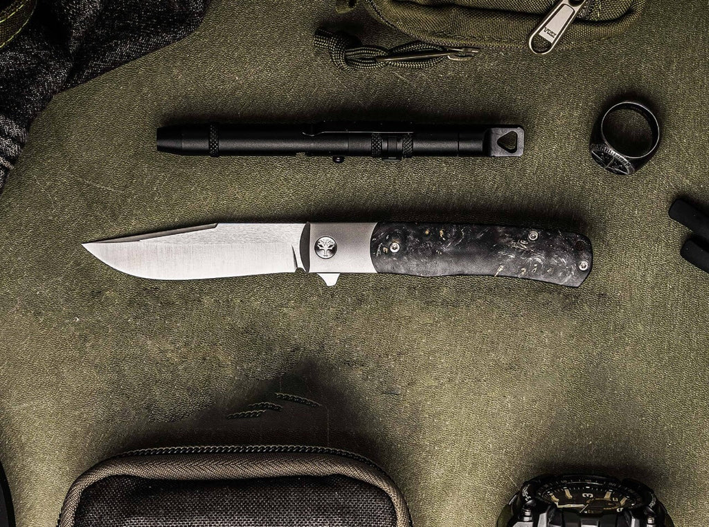Diskret im Namen – souverän im Auftritt. Das Böker TRPPR (gesprochen: Trapper) ist ein außergewöhnliches Gentleman Messer, das den Geist des erfolgreichen Böker Trapper in eine neue Zeit überträgt. Wenngleich auf das Wesentliche reduziert, lässt das Taschenmesser an nichts vermissen. Die kugelgelagerte Klinge aus pulvermetallurgischem MagnaCut (61-62 HRC) öffnet seidenweich per Flipper, während der elegante Integral-Framelock mit Overtravel-Stop das Messer zuverlässig sichert. Der verwendete Klingenstahl zeichnet sich vor allem durch eine hohe Verschleißfestigkeit, einer hohen Zähigkeit sowie einer hohen Korrosionsbeständigkeit aus und wird durch ein attraktives Two Tone Finish abgerundet. Die lange Backe des Titangriffkörpers interpretiert den nostalgischen Zeitgeist neu und formt das TRPPR mit seinen Griffschalen aus grünem Micarta zu einem neuen Leitbild zeitgenössischer Messerkultur. Dekorative Akzente setzen die vordere Klingenachsschraube, bei der das berühmte Böker Baumzeichen verwendet wird, und der aus dem Vollen gefräste Titanclip (Tip-Up/r) mit Kugel. Die Auslieferung des Böker TRPPR Micarta erfolgt in einemhochwertigen Filzetui. Handgefertigt in der Böker Manufaktur Solingen. Warnhinweise und Sicherheitsinformationen:Schnittverletzungen: Die häufigste Gefahr bei der Verwendung von Messern ist das Risiko von Schnittverletzungen. Scharfe Klingen können schnell durch Haut und Gewebe dringen.Abrutschen des Messers: Ein unsachgemäßes oder zu starkes Drücken kann dazu führen, dass das Messer abrutscht und unkontrollierte Bewegungen entstehen, die Verletzungen verursachen können.Verletzungen durch Stürze: Messer sollten niemals ungesichert oder in der Nähe von Tischkanten abgelegt werden, um zu verhindern, dass sie herunterfallen und jemanden verletzen.Stumpfe Messer: Stumpfe Messer stellen ein größeres Verletzungsrisiko dar, da sie mehr Kraft erfordern und leichter abrutschen können. Messer sollten daher regelmäßig sachgemäß nachgeschärft werden.Nicht bestimmungsgemäße Nutzung: Das Verwenden eines Messers für Aufgaben, für die es nicht vorgesehen ist (z.B. als Hebelwerkzeug), kann nicht nur die Klinge beschädigen, sondern auch zu Unfällen führen.
