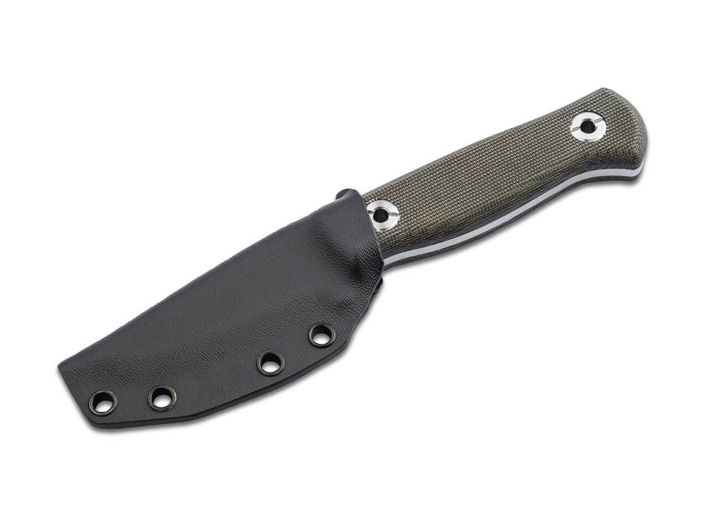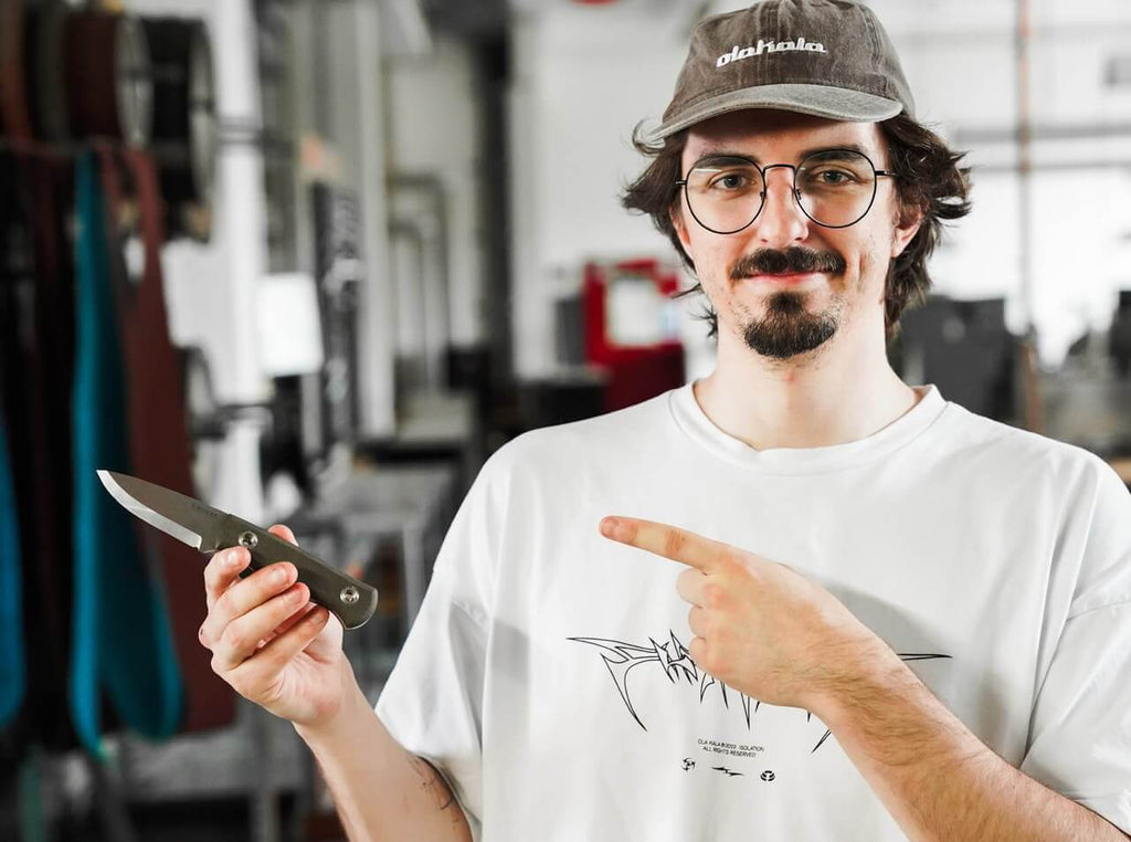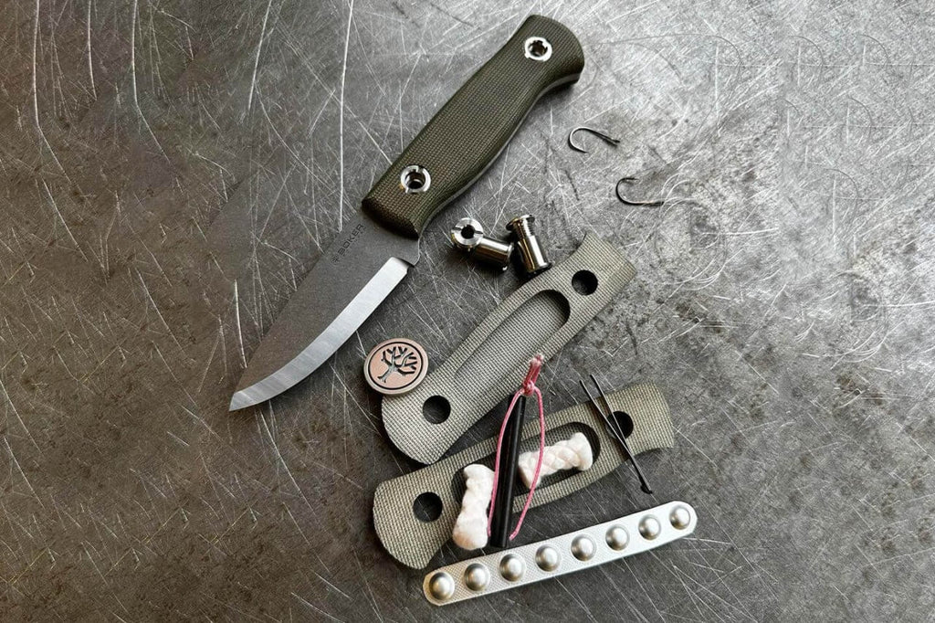 Zwei Streamer in der Wildnis? Messer statt Controller? Hungern statt Happy Slice Pizza? Klingt absurd, wird aber wahr: Der Hamburger Trymacs (29) und der Bonner Rumathra (27) treten als Team gemeinsam bei der kommenden Staffel von 7 vs. Wild an und stellen sich dem 14-tägigen Abenteuer in der Wildnis Kanadas. Die beiden Schwergewichte aus der deutschen Streaming-/Gaming Szene vereinen gemeinsam über 4 Millionen Follower auf Twitch (Trymacs 3,4 Mio., Rumathra 0,7 Mio.) und sind auch auf Youtube und Instagram reichweitenstark vertreten. Im Rahmen der intensiven Vorbereitung auf diese Grenzerfahrung spielte die Wahl der richtigen Ausrüstung – insbesondere, weil alle Gegenstände zusammen in einer 1L Nalgene-Flasche untergebracht werden müssen – eine elementare Rolle für die Beiden.Gemeinsam mit Rumathra, der uns mehrfachin unserer Solinger Manufaktur besuchte, entwickelten und bauten wir ein eigenes Messer, welches perfekt auf die Anforderungen und Gegebenheiten des anstehenden Outdoor-Abenteuers abgestimmt ist. Basis für die Neuentwicklung ist das von Dave Wenger entworfene Outdoor- und Bushcraft Messer Böker Plus Vigtig (s. Seite 105), welches aufgrund seiner Dimensionen (Gesamtlänge: 19,7 cm; Klingenstärke: 4 mm) nicht nur perfekt in die Flasche passte, sondern auf härteste Beanspruchungen ausgelegt ist. Die Wahl des Klingenstahls fiel auf Magnacut, der anders als die üblicherweise verwendeten Werkzeugstähle speziell für den Messerbau entwickelt wurde. Bei diesem als „Wunderstahl“ gefeierten Stahl ist es gelungen trotz des hohen Chromgehaltes von 10,7% und einer beeindruckenden Härtbarkeit von über 61-62 HRC ein sehr feines Gefüge und damit hohe Zähigkeit und Schocklastverträglichkeit zu erzielen.In Kombination mit dem True-Scandi Schliff trotzt die Klinge im Stonewash-Finish jeder anfallenden Herausforderung: von feinen Schneid- und Schnitzaufgaben zum Lagerbau und der Feuerholz-Vorbereitung, über Batoning und Hacken bis hin zur Wildversorgung. Um den Platz in der Nalgene Flasche optimal auszunutzen, wurden die beiden Griffschalen aus grünem Canvas Micarta etwas flacher gehalten als bei der Ursprungsversion und gewährleisten auch im nassen Zustand eine perfekte Handlage. Ein besonderes Highlight befindet sich im Inneren des Griffs. Anstelle von Hohlnieten lassen sich die beiden großen Schrauben mithilfe einer Münze einfach demontieren; zum Vorschein kommt ein gemessen an den Außendimensionen des Griffs üppiges Fach mit einer Tiefe von 14 mm, indem beispielsweise eine Pinzette ,Zunder, Kohletabletten, ein Angelset und Sicherheitsnadeln problemlos untergebracht werden können. Auch als skelettiertes Messerohne Griffschalen macht das vollständig in Solingen gefertigte Böker Vigtig vs. Wild eine gute Figur und unterstreicht die Vielseitigkeit des Sondermodells.Abgerundet wird der Lieferumgang durch eine kompakte Kydexscheide in schwarz mit Clip. Warnhinweise und Sicherheitsinformationen:Schnittverletzungen: Die häufigste Gefahr bei der Verwendung von Messern ist das Risiko von Schnittverletzungen. Scharfe Klingen können schnell durch Haut und Gewebe dringen.Abrutschen des Messers: Ein unsachgemäßes oder zu starkes Drücken kann dazu führen, dass das Messer abrutscht und unkontrollierte Bewegungen entstehen, die Verletzungen verursachen können.Verletzungen durch Stürze: Messer sollten niemals ungesichert oder in der Nähe von Tischkanten abgelegt werden, um zu verhindern, dass sie herunterfallen und jemanden verletzen.Stumpfe Messer: Stumpfe Messer stellen ein größeres Verletzungsrisiko dar, da sie mehr Kraft erfordern und leichter abrutschen können. Messer sollten daher regelmäßig sachgemäß nachgeschärft werden.Nicht bestimmungsgemäße Nutzung: Das Verwenden eines Messers für Aufgaben, für die es nicht vorgesehen ist (z.B. als Hebelwerkzeug), kann nicht nur die Klinge beschädigen, sondern auch zu Unfällen führen.