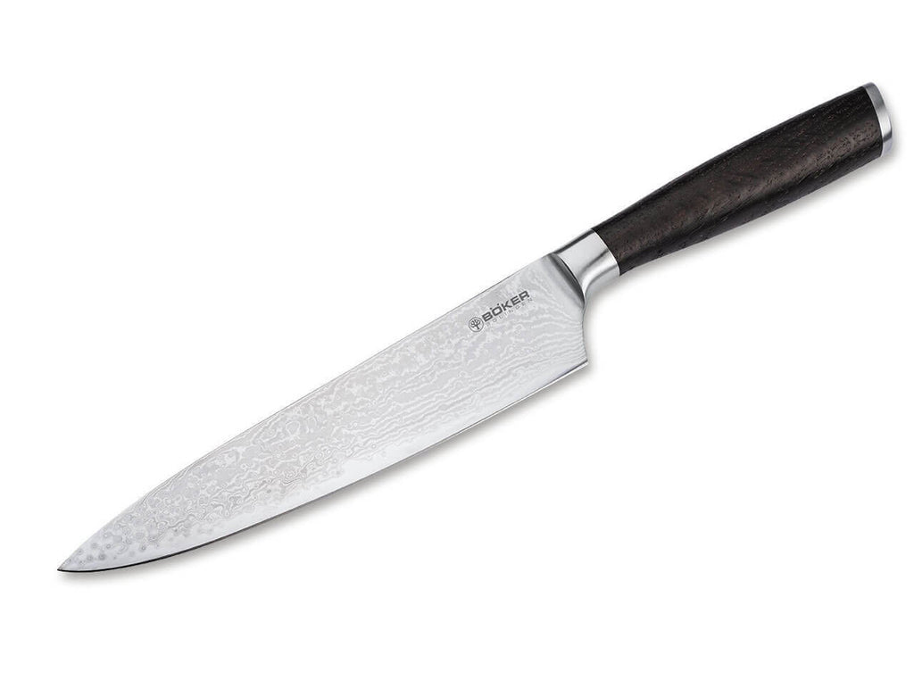 Kochen geht weit über die Zubereitung von Lebensmitteln hinaus. Pure Leidenschaft, die mit einer grenzenlosen Vielfalt an Möglichkeiten gewürzt ist und unvergessliche Momente mit Familie und Freunden schafft. Kochen bewegt, Kochen verbindet. Eine Philosophie als perfekter Vitaminlieferant für das innere Gleichgewicht. Die Premium-Kochmesser-Serie Böker Meisterklinge Damast teilt diese Passion auf ganzer Linie: souverän im Auftritt, erstklassige Handlage mit ausgewogener Balance, ausdrucksstark ohne aufdringlich zu sein und immer mit der individuellen Note garantieren die exklusiven Küchenmesser das Plus an Genuss. Nie mehr stumpfe Messer: Feinstes Solinger Messerhandwerk aus Meisterhand und hochwertige Materialien als Einklang für ein fantastisch scharfes Schneideerlebnis - jeden Tag - immer wieder - und dank des kostenlosen Böker Nachschärf-Services ein Leben lang. Das Geheimnis der herausragenden Schärfe liegt in der Hybrid-Klinge, die das Beste aus zwei Welten vereint. Der Klingenkern besteht aus hochfestem und langlebigem VG-10 Stahl, der die Schneide außergewöhnlich scharf macht - und lange scharf hält, während die schützende Klingen-Ummantelung aus mehrlagigem Damast für die nötige Flexibilität, Bruchfestigkeit sowie die kultivierte Par-Excellence-Optik sorgt. So gleitet das Messer nahezu mühelos durch reife Tomaten und Fleisch, womit selbst das anspruchsvolle Schneiden hauchzarter Scheiben bis hin zu großen Stücken Begeisterung auslöst. Konsequent, kernig und von Natur aus bergisch: Der dunkle Griff aus geräuchertem Eichenholz stammt aus den heimischen Wäldern des Bergischen Landes und macht die lange Böker Tradition mit jedem Schnitt erlebbar. Sanft geschwungenen Linien schmiegen sich nahtlos in die Hand und vermitteln jederzeit sicheren Halt, Ausgewogenheit und die Böker typische Dynamik. Abgerundet wird das wertige Erscheinungsbild durch den edlen Metallknauf am Griffende mit eingelassenem Böker Logo – ein diskretes Statement für Understatement. Die Kochmesser werden für viele Jahre ein treuer Begleiter in der Küche sein. Zuverlässig, zeitlos und unbeschwert. Damit das so bleibt, gibt Böker eine lebenslange Garantie auf Material und Verarbeitung. Das bedeutet weniger Sorgen und mehr Freiraum für kulinarische Ideen. NO RISK, MORE FUN: Lassen Sie sich von einem meisterhaften Schneideerlebnis überzeugen und testen Sie die Kochmesser der Meisterklinge Damast Serie ausgiebig zu Hause mit 30 Tage Geld-zurück- Garantie und kostenlosem Rückversand! Böker Meisterklinge Damast – ein Bekenntnis, bei dem Genuss zur Leidenschaft wird. Warnhinweise und Sicherheitsinformationen:Schnittverletzungen: Die häufigste Gefahr bei der Verwendung von Messern ist das Risiko von Schnittverletzungen. Scharfe Klingen können schnell durch Haut und Gewebe dringen.Abrutschen des Messers: Ein unsachgemäßes oder zu starkes Drücken kann dazu führen, dass das Messer abrutscht und unkontrollierte Bewegungen entstehen, die Verletzungen verursachen können.Verletzungen durch Stürze: Messer sollten niemals ungesichert oder in der Nähe von Tischkanten abgelegt werden, um zu verhindern, dass sie herunterfallen und jemanden verletzen.Stumpfe Messer: Stumpfe Messer stellen ein größeres Verletzungsrisiko dar, da sie mehr Kraft erfordern und leichter abrutschen können. Messer sollten daher regelmäßig sachgemäß nachgeschärft werden.Nicht bestimmungsgemäße Nutzung: Das Verwenden eines Messers für Aufgaben, für die es nicht vorgesehen ist (z.B. als Hebelwerkzeug), kann nicht nur die Klinge beschädigen, sondern auch zu Unfällen führen.