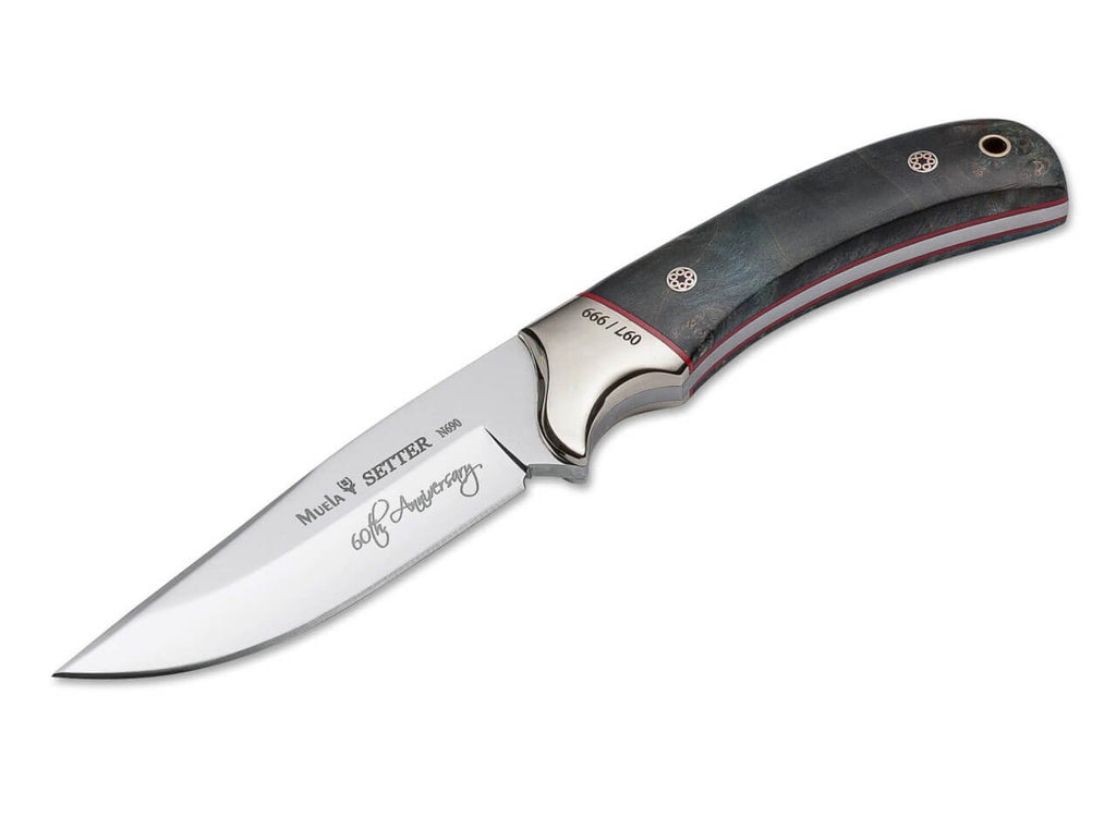 Mit ihren hochwertigen Jagdmessern Made in Spain und der hohen Fertigungstiefe ist Muela aus der Szene der klassischen wie auch der modernen Jagdmesser (und inzwischen auch zunehmend der Outdoor- und Bushcraftmesser) nicht mehr wegzudenken. Die Fähigkeit, Hirschhorn in einer Serienfertigung auf so konstant hohem Niveau zu verarbeiten, sucht seinesgleichen, und die Verwendung moderner Stähle wie z.B. dem stickstofflegierten Sandvik-Stahl 14C28N bei ausgesuchten Modellen zeigt, dass nicht nur Traditionen gepflegt werden, sondern auch ein ausgezeichnetes Gespür für die Bedürfnisse des Marktes vorhanden ist. Einen besonderen Akzent setzen auch die Lederscheiden, die ebenfalls von Muela selbst gefertigt werden und immer von höchster Qualität sind. Zum 60. Firmenjubiläum erfreut uns Muela mit einigen limitierten Sondermodellen, die mit besonders erlesenen Materialien und in edler Ausführung in einer Sammlerschatulle geliefert werden.Das Setter Anniversary ist mit blauen stabilisierten Ahorn-Wurzelholz-Griffschalen ausgestattet, die mit zwei äußerst dekorativen Mosaikpins befestigt sind und von roten Fiberlagen eingefasst sind. Als Klingenstahl kommt Böhler N690 zum Einsatz, was den Sammler ebenso begeistert wie den praktischen Anwender. Die Neusilberbacke trägt die individuelle Seriennummer, und auf der Klinge ist eine Anniversary-Laserung aufgebracht. Ein edles Sammlerstück, das mit Lederscheide geliefert wird. Limitiert auf 999 Exemplare weltweit. Warnhinweise und Sicherheitsinformationen:Schnittverletzungen: Die häufigste Gefahr bei der Verwendung von Messern ist das Risiko von Schnittverletzungen. Scharfe Klingen können schnell durch Haut und Gewebe dringen.Abrutschen des Messers: Ein unsachgemäßes oder zu starkes Drücken kann dazu führen, dass das Messer abrutscht und unkontrollierte Bewegungen entstehen, die Verletzungen verursachen können.Verletzungen durch Stürze: Messer sollten niemals ungesichert oder in der Nähe von Tischkanten abgelegt werden, um zu verhindern, dass sie herunterfallen und jemanden verletzen.Stumpfe Messer: Stumpfe Messer stellen ein größeres Verletzungsrisiko dar, da sie mehr Kraft erfordern und leichter abrutschen können. Messer sollten daher regelmäßig sachgemäß nachgeschärft werden.Nicht bestimmungsgemäße Nutzung: Das Verwenden eines Messers für Aufgaben, für die es nicht vorgesehen ist (z.B. als Hebelwerkzeug), kann nicht nur die Klinge beschädigen, sondern auch zu Unfällen führen.