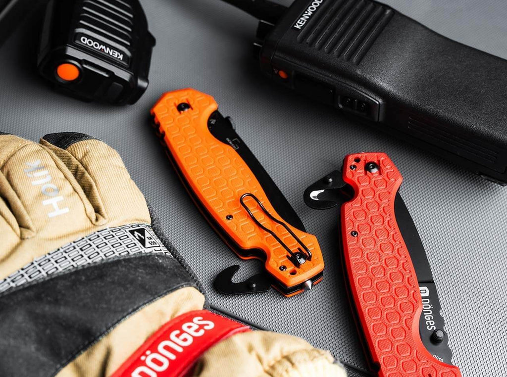 Diese Messer sind mit einer durchschnittlichen Klingenlänge von 11,6 cm speziell für die Verwendung mit Handschuhen (auch schweren Hitzeschutzhandschuhen) dimensioniert. Die Griffschalen sind einheitlich aus hitzebeständigem G10 mit rutschfester Dönges-Wabenstruktur versehen. Sämtliche Messer besitzen einen 4-fach umsetzbaren Draht-Clip (für die Trageweisen Tip-Up, Tip-Down r/l), Klingen aus schnitthaltigem D2 mit kugelgelagerter Achse, einer Verzahnung an der Klingenbasis für faseriges Material, einen versenkbaren Gurtschneider sowie einen Glasbrecher.Auch in der Professional-Serie ist das Modell für Brandbekämpfer mit einer universell einsetzbaren Spearpoint-Klinge ausgestattet, die wahlweise per Fingerflipper oder Daumen-Pin geöffnet werden kann. Die Dimensionen sind hier jedoch größer als in der Basic-Linie und der Gurtschneider ist im Griff versenkbar. Die mit Dönges-Wabenstruktur gefrästen Griffschalen sind aus rotem G10. Warnhinweise und Sicherheitsinformationen:Schnittverletzungen: Die häufigste Gefahr bei der Verwendung von Messern ist das Risiko von Schnittverletzungen. Scharfe Klingen können schnell durch Haut und Gewebe dringen.Abrutschen des Messers: Ein unsachgemäßes oder zu starkes Drücken kann dazu führen, dass das Messer abrutscht und unkontrollierte Bewegungen entstehen, die Verletzungen verursachen können.Verletzungen durch Stürze: Messer sollten niemals ungesichert oder in der Nähe von Tischkanten abgelegt werden, um zu verhindern, dass sie herunterfallen und jemanden verletzen.Stumpfe Messer: Stumpfe Messer stellen ein größeres Verletzungsrisiko dar, da sie mehr Kraft erfordern und leichter abrutschen können. Messer sollten daher regelmäßig sachgemäß nachgeschärft werden.Nicht bestimmungsgemäße Nutzung: Das Verwenden eines Messers für Aufgaben, für die es nicht vorgesehen ist (z.B. als Hebelwerkzeug), kann nicht nur die Klinge beschädigen, sondern auch zu Unfällen führen.