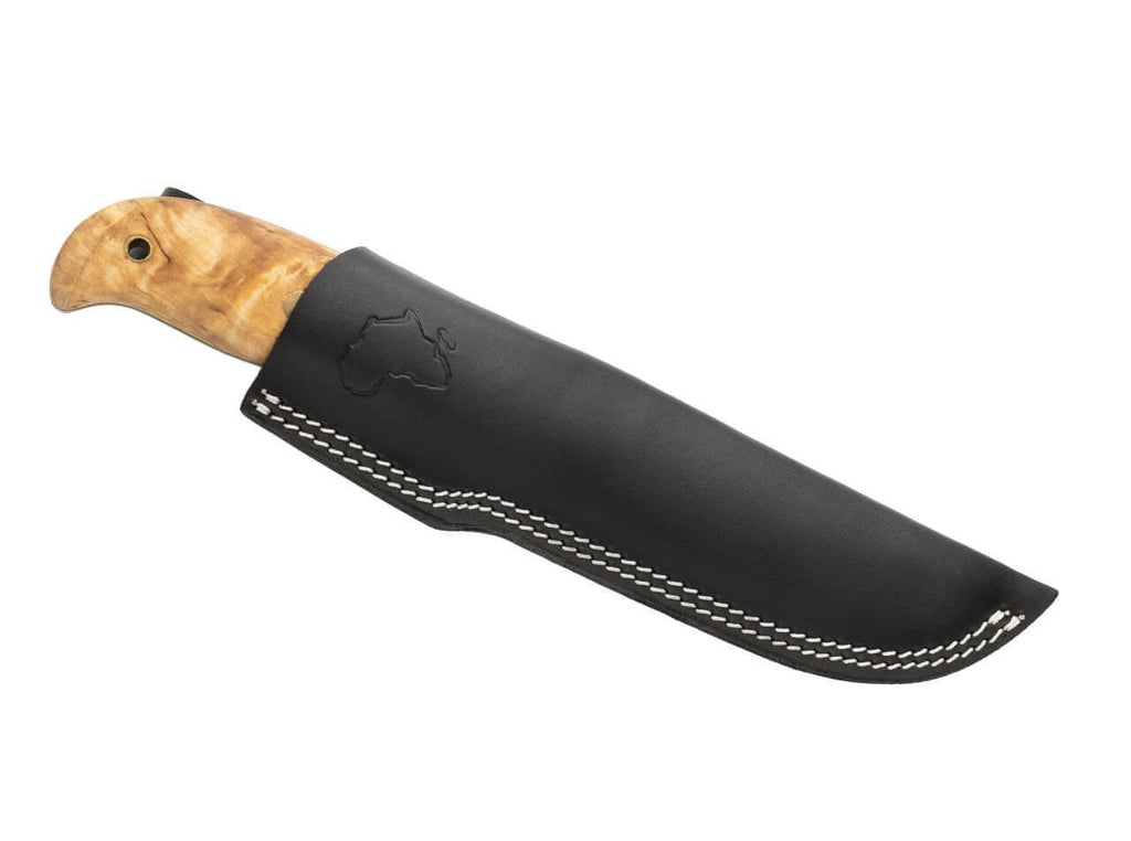 Helle präsentiert stolz ein neues und verbessertes Didi Galgalu – sein meistverkauftes Messer für Wildnis und Bushcraft. Galgalu ist ein Messer für große Abenteurer. Es wurde in Zusammenarbeit mit dem Voetspore-Team entwickelt und ist jedem transkontinentalen Abenteuer gewachsen. Einzigartig sowohl in seinem Design als auch in seiner Entwicklung. Das neue Didi Galgalu ist aus 14C28N-Stahl mit einer scharfen Klinge gefertigt und verfügt über einen schönen Griff aus gewirbeltem Birkenholz. Nicht zu groß, nicht zu klein – es ist das perfekte Messer für jedes Abenteuer. Das Messer selbst ist recht groß und eignet sich für mittlere bis große Hände. Die Form des Griffs bietet dank der doppelten Konturierung einen festen und sicheren Halt, selbst wenn man das Messer nahe an der Klinge hält. Der Griff wird von zwei stabilen Messingnieten und einer Rohrniete gehalten, an der man eine Schnur oder ein Lederband befestigen kann. Die Klinge ist dünn genug, um beim Schneiden oder Schnitzen gute Leistungen zu erbringen, aber dennoch stark genug für schwerere Aufgaben. Sie ist mit einem Scandi-Schliff geformt und geschliffen und sofort einsatzbereit. Das Didi hat sich international in der Bushcraft- und Outdoor-Community etabliert. Es wird mit einer hochwertigen Lederscheide in neuem Design für den sicheren Transport geliefert. Warnhinweise und Sicherheitsinformationen:Schnittverletzungen: Die häufigste Gefahr bei der Verwendung von Messern ist das Risiko von Schnittverletzungen. Scharfe Klingen können schnell durch Haut und Gewebe dringen.Abrutschen des Messers: Ein unsachgemäßes oder zu starkes Drücken kann dazu führen, dass das Messer abrutscht und unkontrollierte Bewegungen entstehen, die Verletzungen verursachen können.Verletzungen durch Stürze: Messer sollten niemals ungesichert oder in der Nähe von Tischkanten abgelegt werden, um zu verhindern, dass sie herunterfallen und jemanden verletzen.Stumpfe Messer: Stumpfe Messer stellen ein größeres Verletzungsrisiko dar, da sie mehr Kraft erfordern und leichter abrutschen können. Messer sollten daher regelmäßig sachgemäß nachgeschärft werden.Nicht bestimmungsgemäße Nutzung: Das Verwenden eines Messers für Aufgaben, für die es nicht vorgesehen ist (z.B. als Hebelwerkzeug), kann nicht nur die Klinge beschädigen, sondern auch zu Unfällen führen.